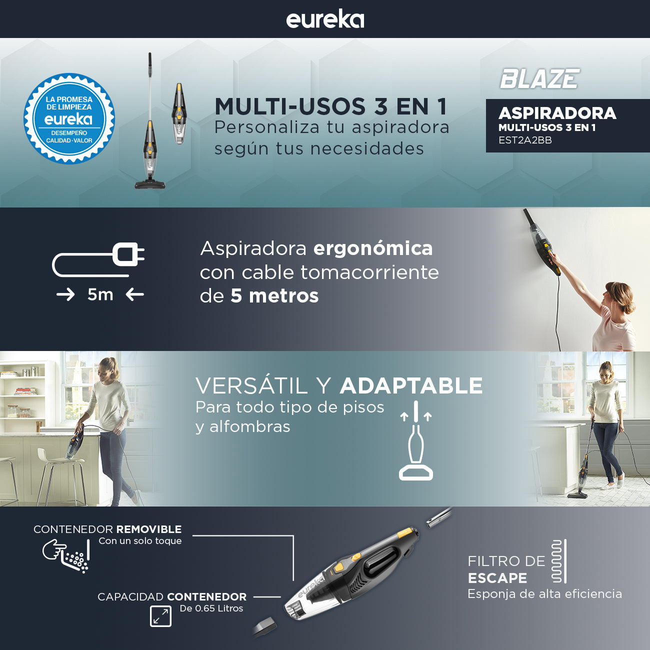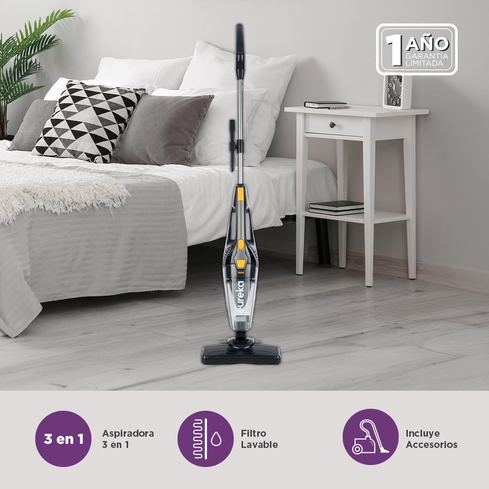 Soy la aspiradora Stick de Eureka, ideal y versátil gracias a mi función 3 en 1 que me permite convertirme fácilmente en aspiradora de mano.