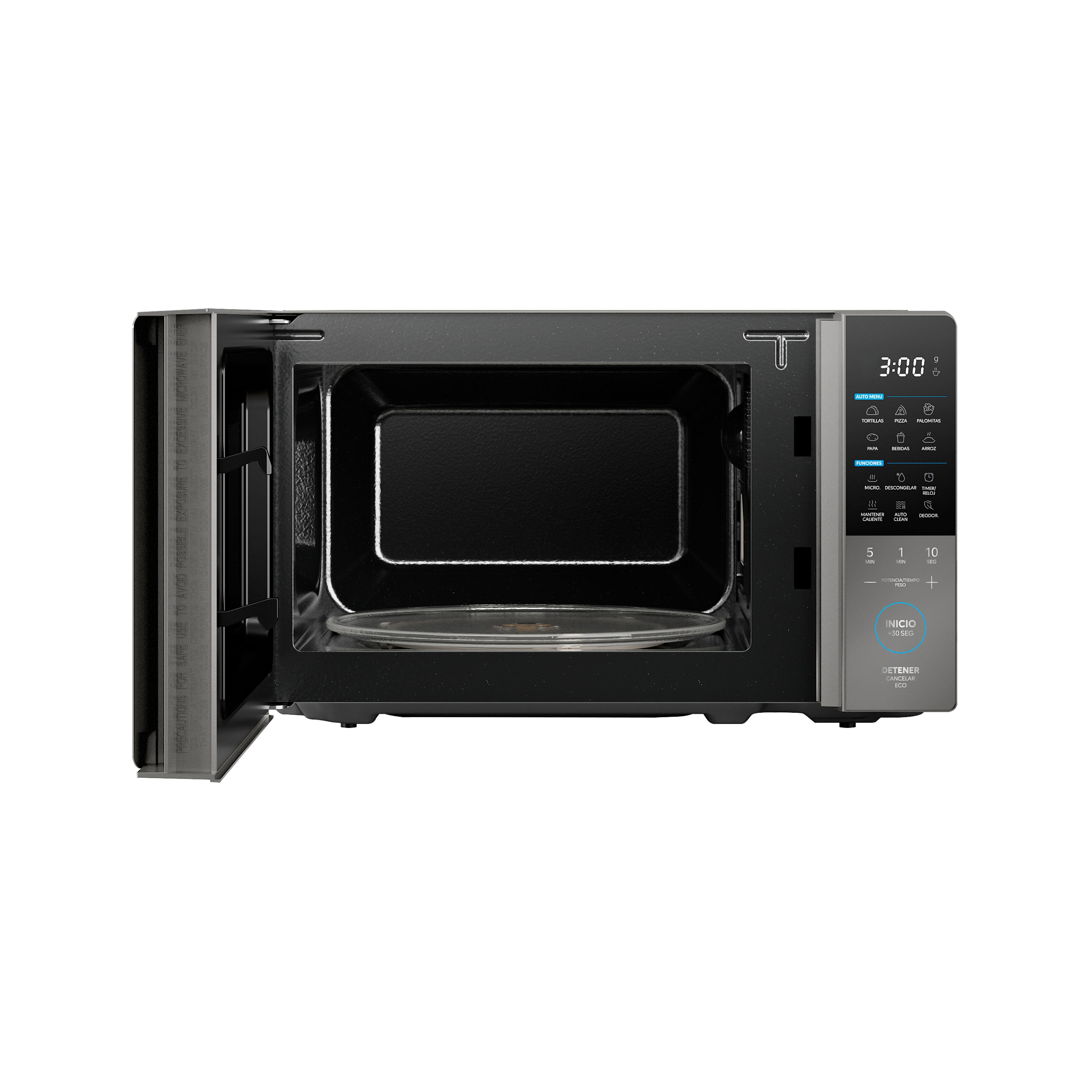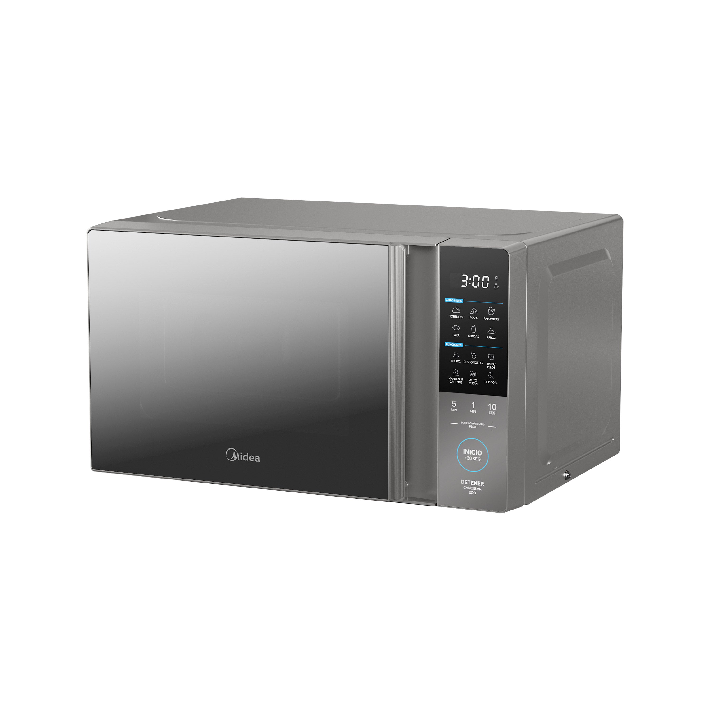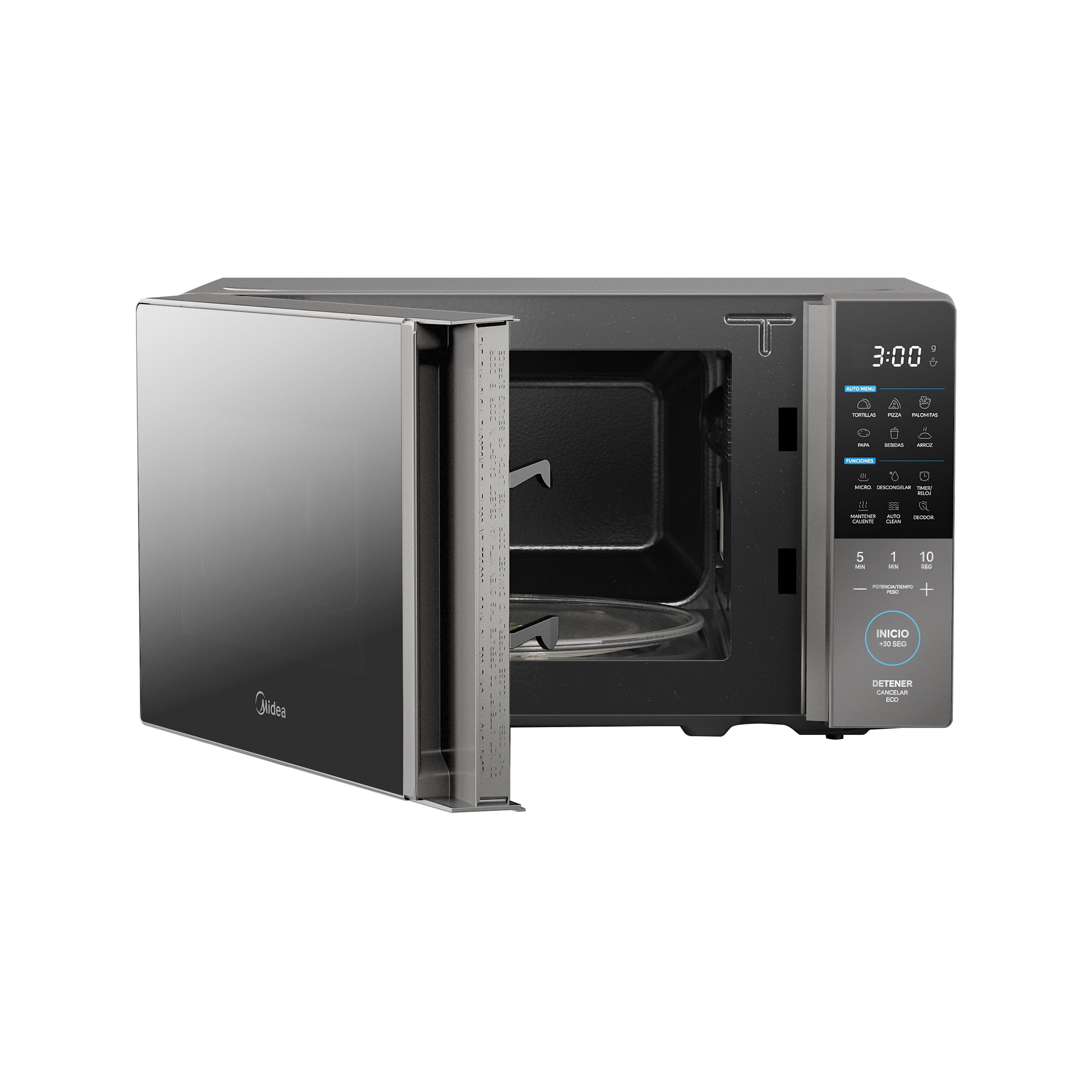 Microondas 0.7 pies cúbicos de capacidad con diseño en color silver, puerta tipo espejo y panel LED digital. Ofrece 6 menús automáticos, tecnología AutoClean, función para mantener caliente y deodorizador que elimina malos olores. Perfecto para maximizar eficiencia en espacios reducidos.