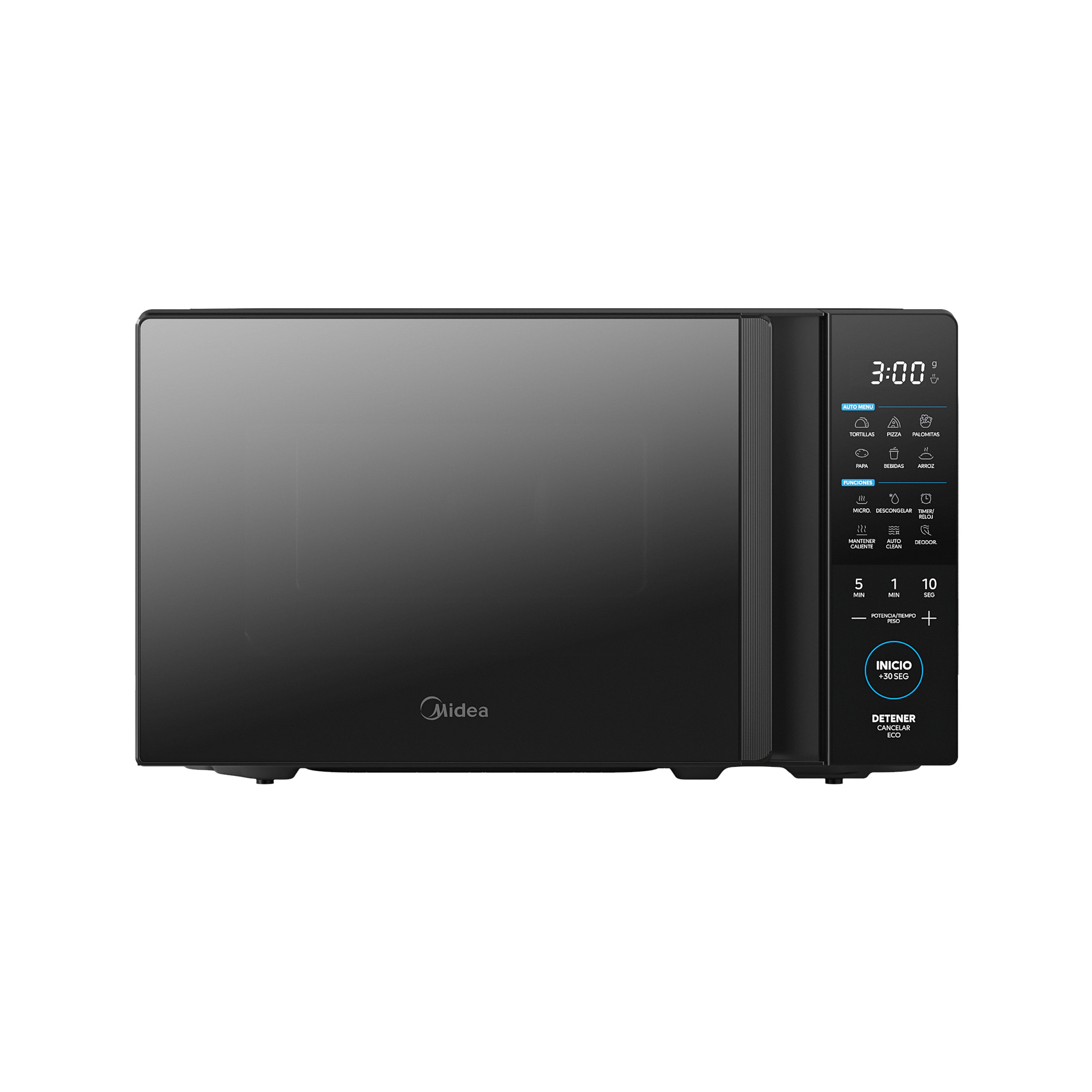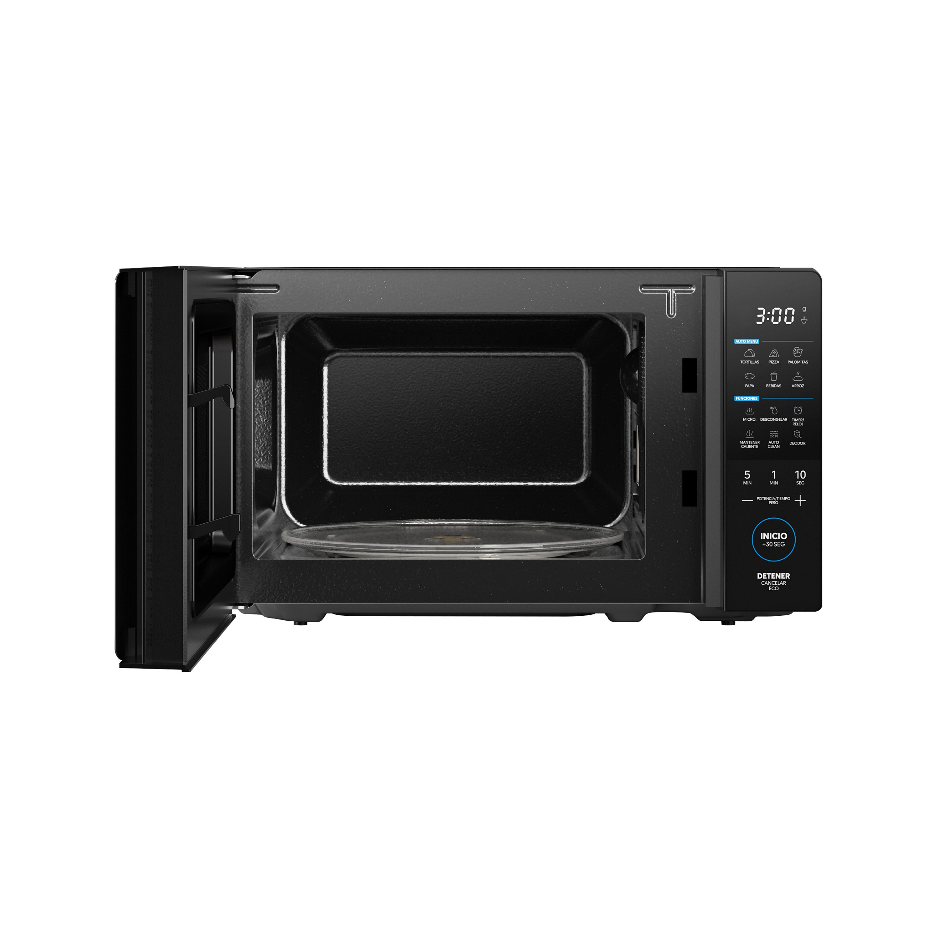 Este microondas negro de 1.1 pies cúbicos es la solución perfecta para quienes buscan funcionalidad y estilo. Su diseño oscuro con puerta espejo y panel digital LED destaca en cualquier espacio. Además, incluye tecnología AutoClean, función para mantener caliente, modo ECO para ahorrar energía y deodorizador que elimina malos olores.