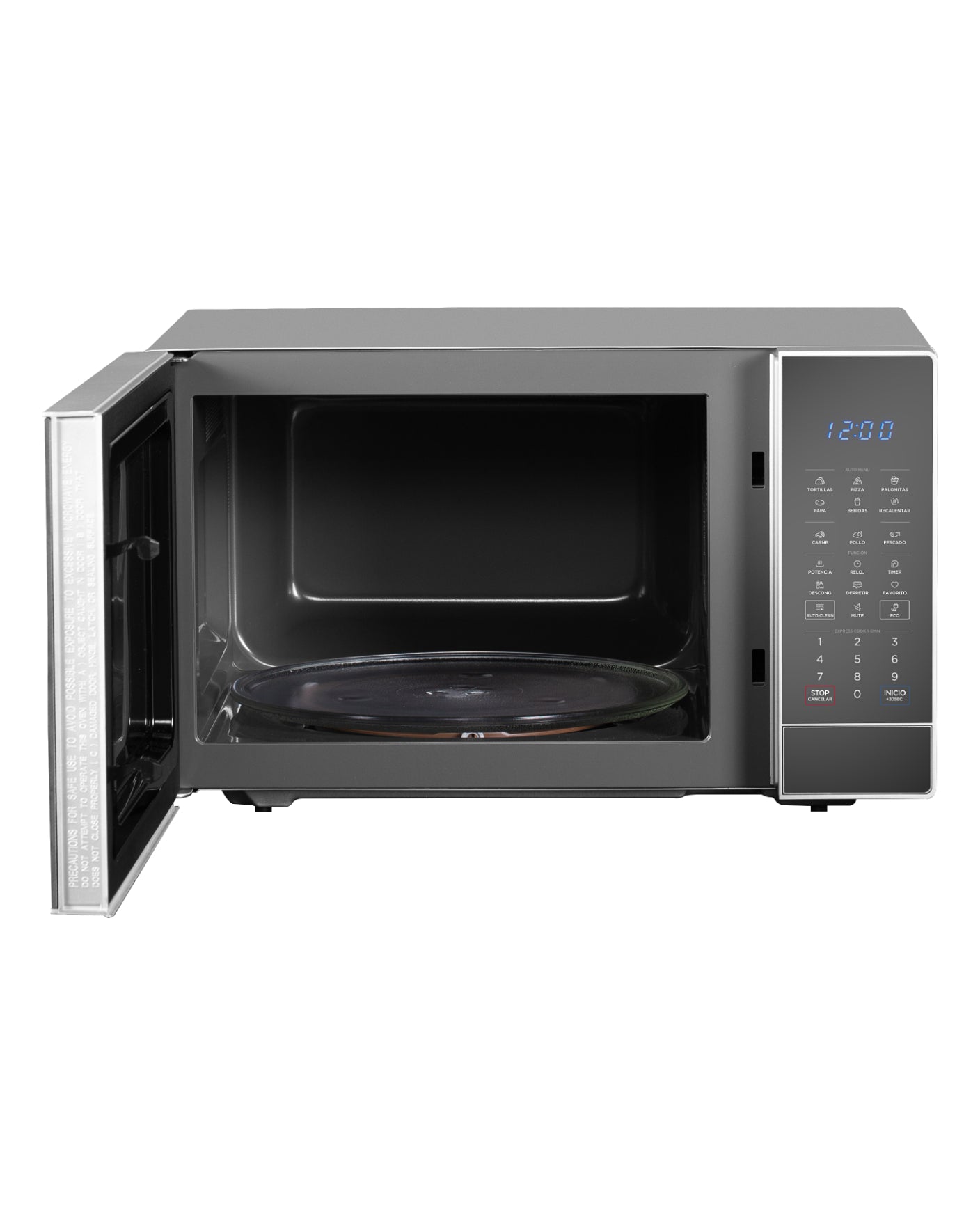 Microondas de 1.1 pies cúbicos, ideal para quienes buscan eficiencia y diseño en un solo electrodoméstico. Su puerta tipo espejo le da un toque sofisticado, ofrece 11 niveles de potencia, función ECO para reducir el consumo energético y 6 menús automáticos (tortillas, papas, palomitas, pizza, bebidas y recalentar) que facilitan su uso. Incluye opciones de descongelado por peso o tiempo, temporizador, reloj y seguro para niños. Perfecto para cualquier hogar moderno.