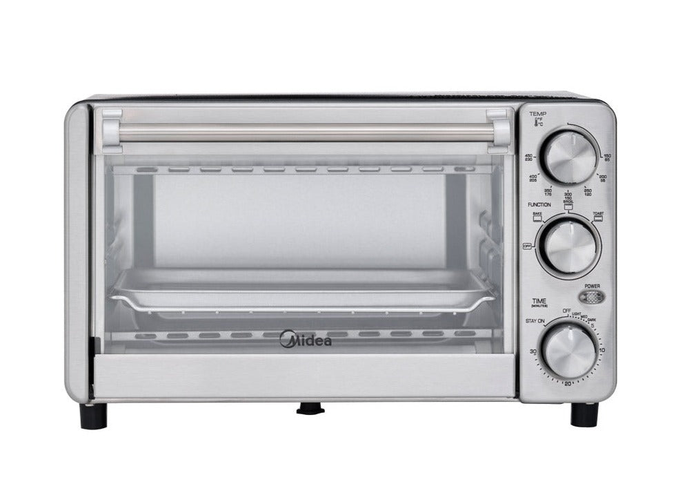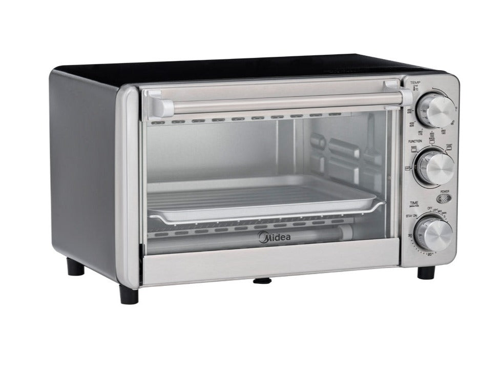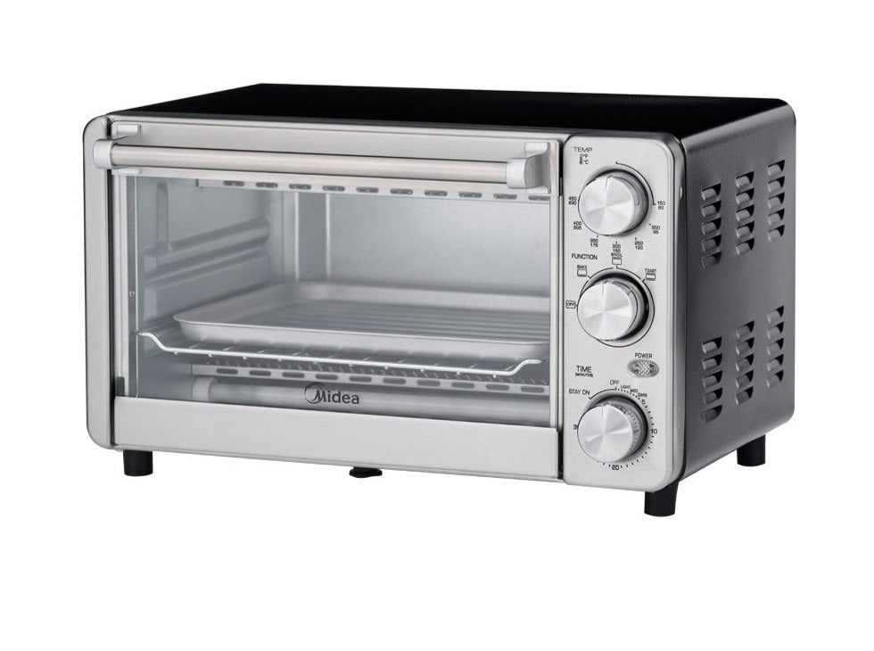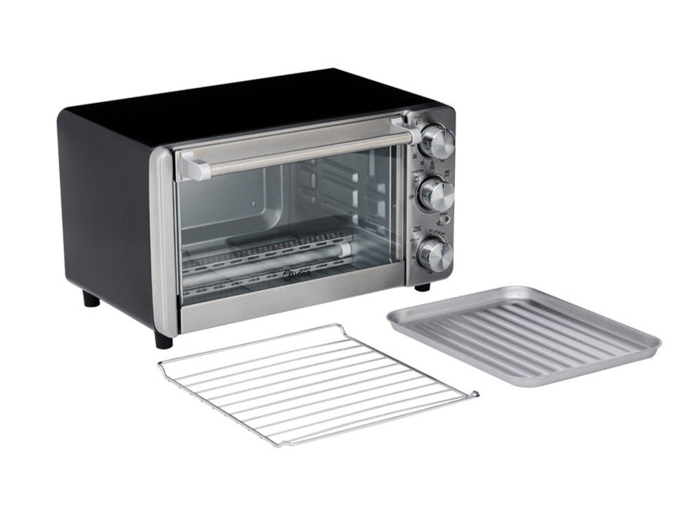 Hornito eléctrico tostador de 12L 4 rebanadas, potencia de 1100W, cubierta de acero inoxidable, timer de hasta 30 min, rango de temperatura de 65-232°C, cavidad galvanizada.
