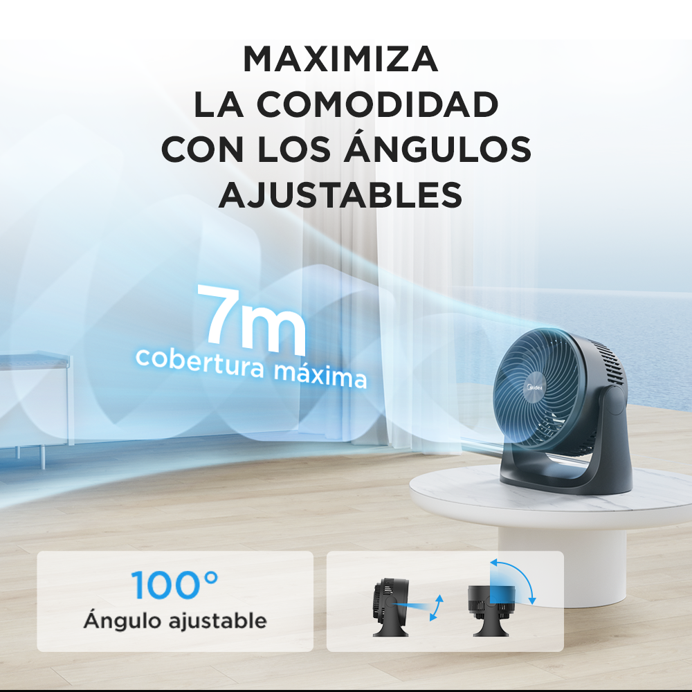 Ventilador mini Turbo de 7 pulgadas, perfecto para uso personal o espacios pequeños. Cuenta con 3 velocidades ajustables y una cabeza inclinable de 100° para dirigir el flujo de aire. Su diseño compacto permite colocarlo en mesa, piso o pared.